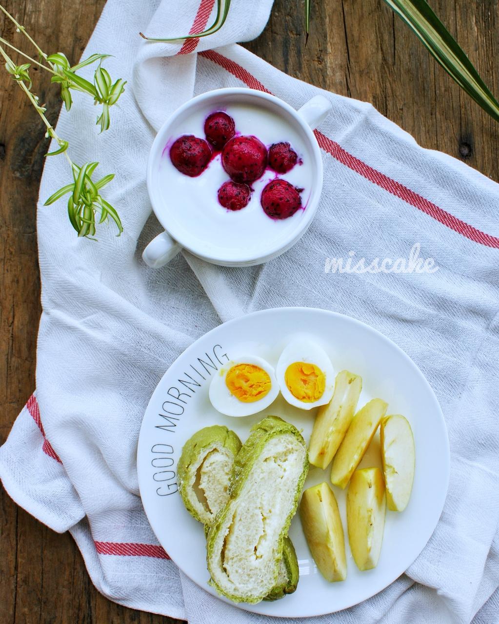 米可早餐D483:榴莲欧包,煮鸡蛋🥚,酸酸甜甜的青苹果🍏,火龙果配酸奶。