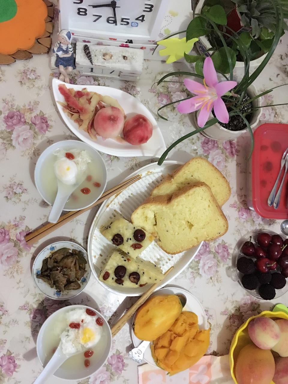 早 亲们🌹!周六早餐来了:面包🍞 发糕🍰 米酒荷包蛋,血桃🍑 芒果(忽略我切芒果的水平哈)+小榨菜... #早餐•20...