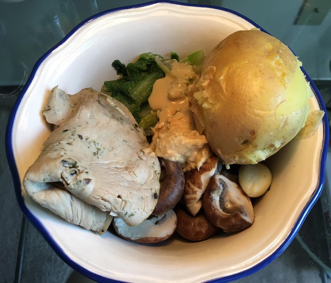 生菜蘑菇火鸡胸土豆+hummus&芝麻酱!中午好呀~~