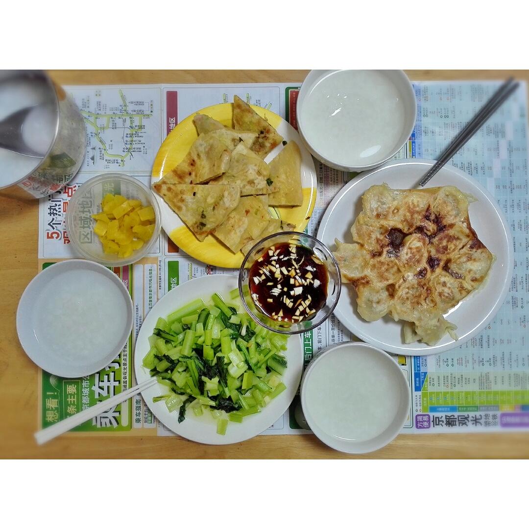 中午煎锅贴,烙饼,炒个小青菜,倒点萝卜干配稀饭,真爽!!饺子馅:猪肉+香葱+胡萝卜+洋葱。