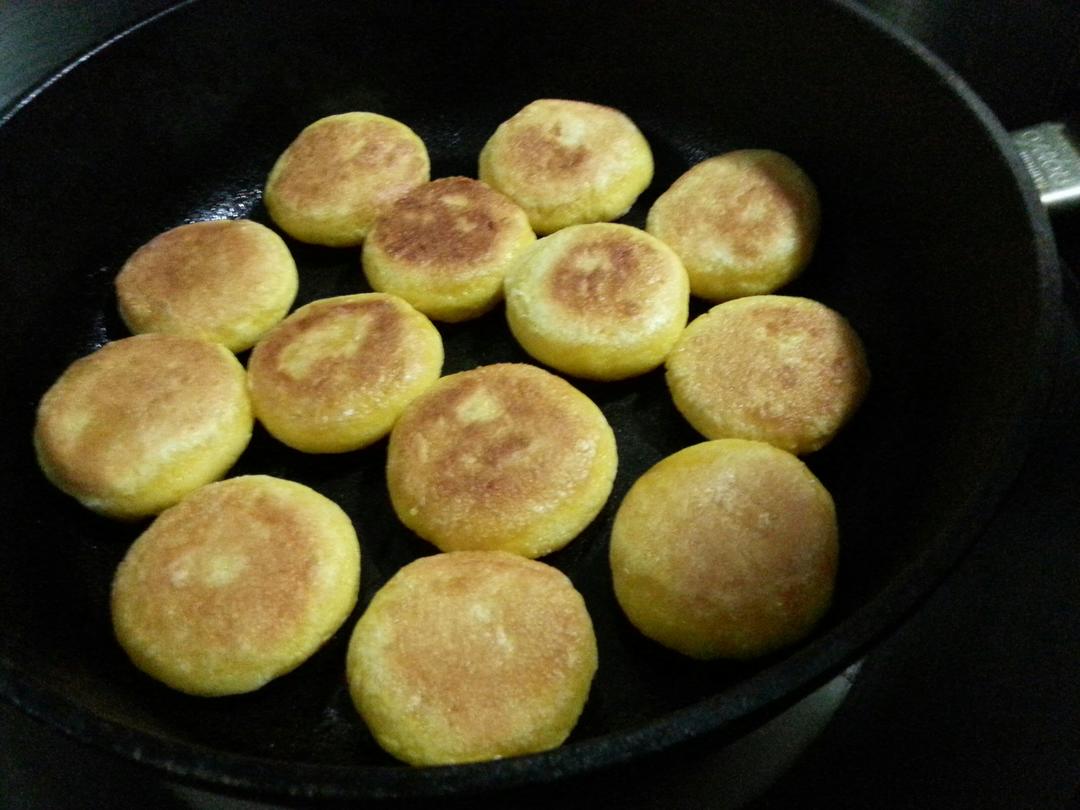 蒸的新南瓜做的水磨糯米粉南瓜饼,随手先烙了几个,本尊金黄金黄的拍出来颜色暗了许多😂