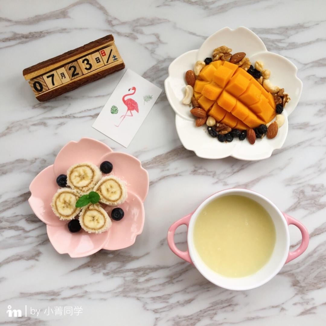椰蓉香蕉吐司卷+小米藜麦粥+芒果&每日坚果