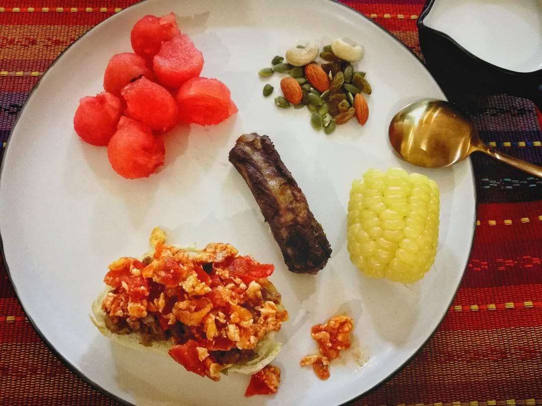 馒头+番茄炒蛋+玉米+西瓜+坚果+牛奶
