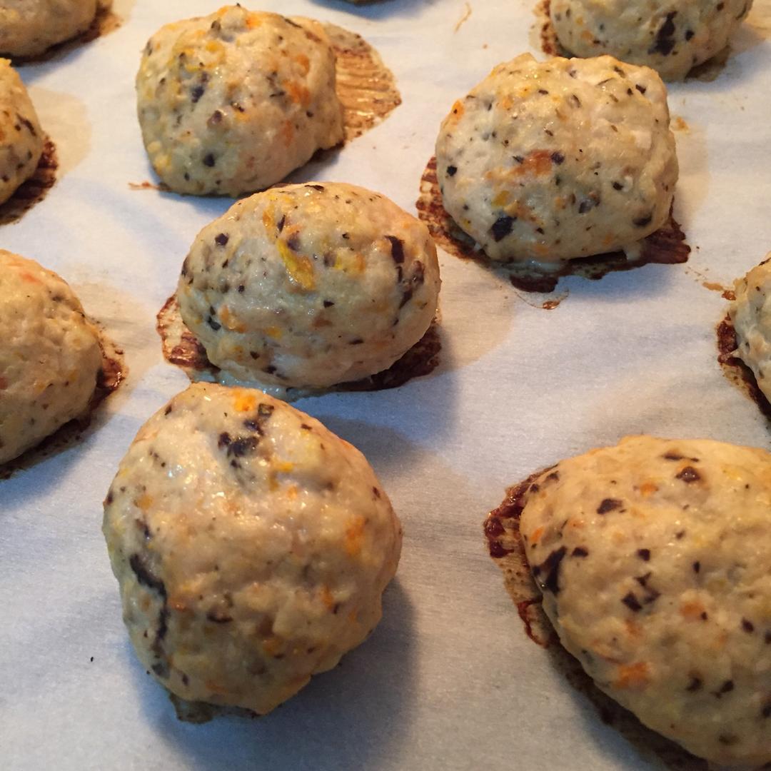 确实很快手,500g minced鸡胸,一根胡萝卜,10颗泡发小香菇;做了20个丸子,410F烤了25分钟,烤的时间略久...