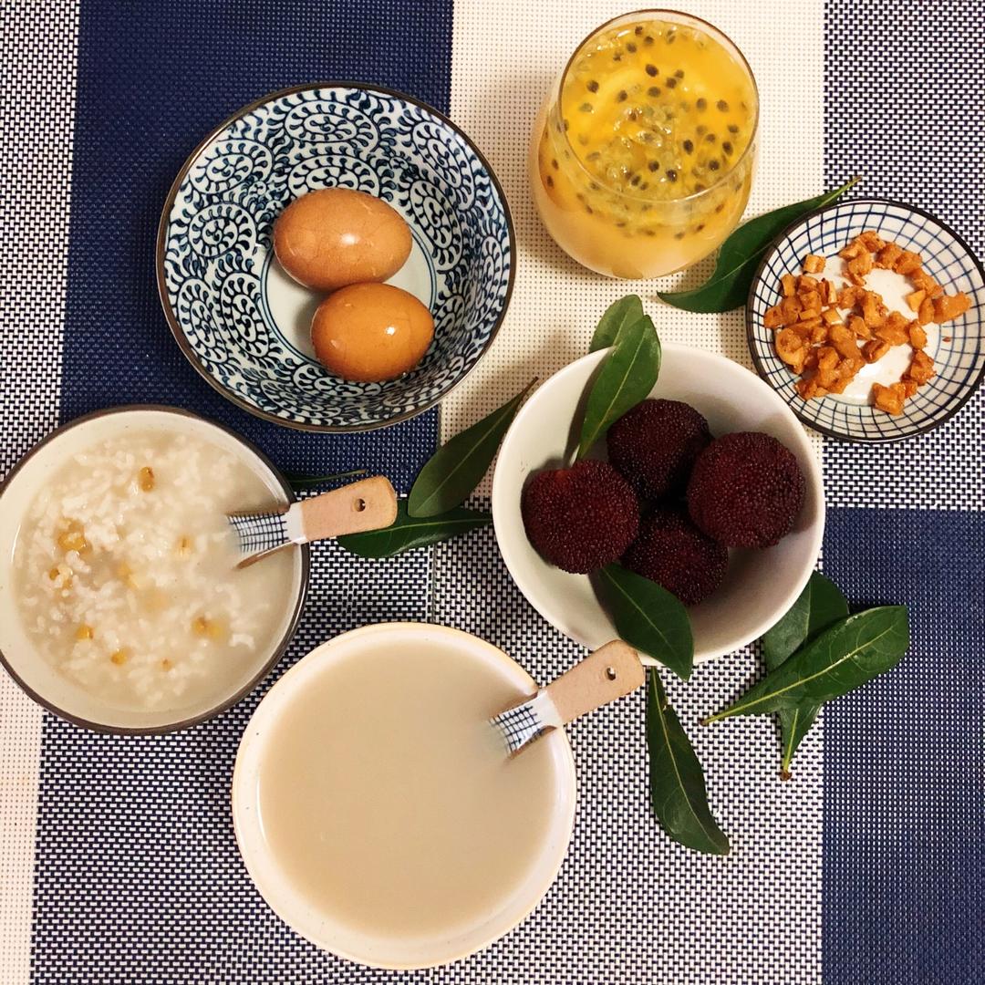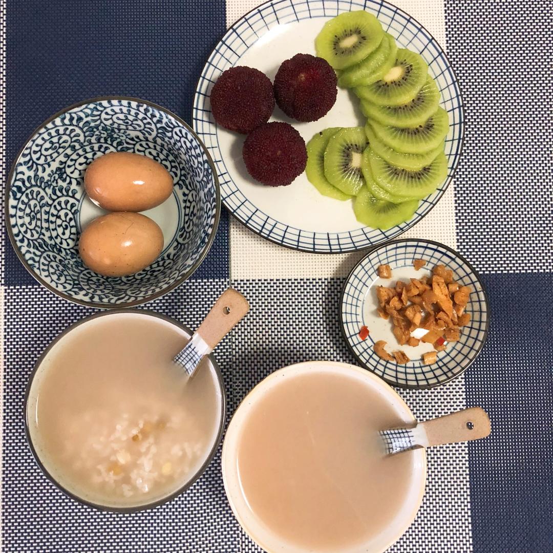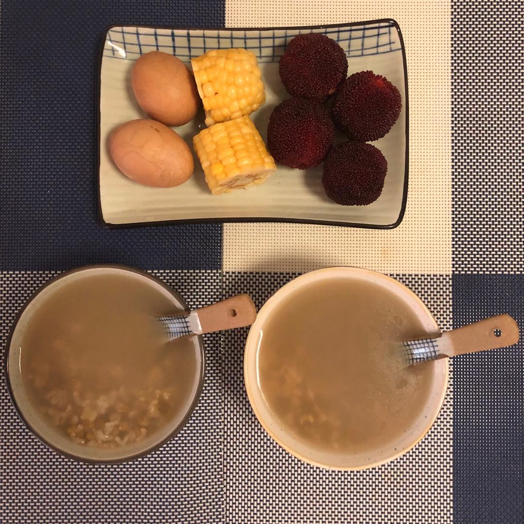 绿豆粥+玉米+茶叶蛋+杨梅