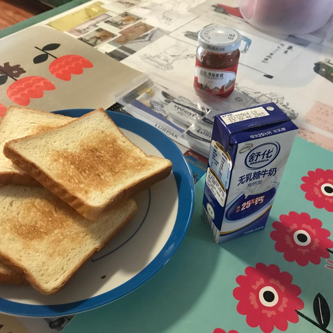 烤面包片、果酱、黄油、牛奶