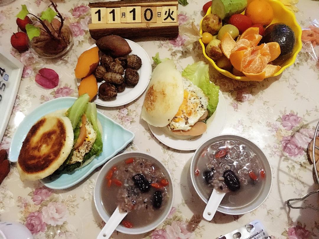 早安☕️! 周五早餐:几米粥+中式汉堡🍔+🍠 芋头+水果...