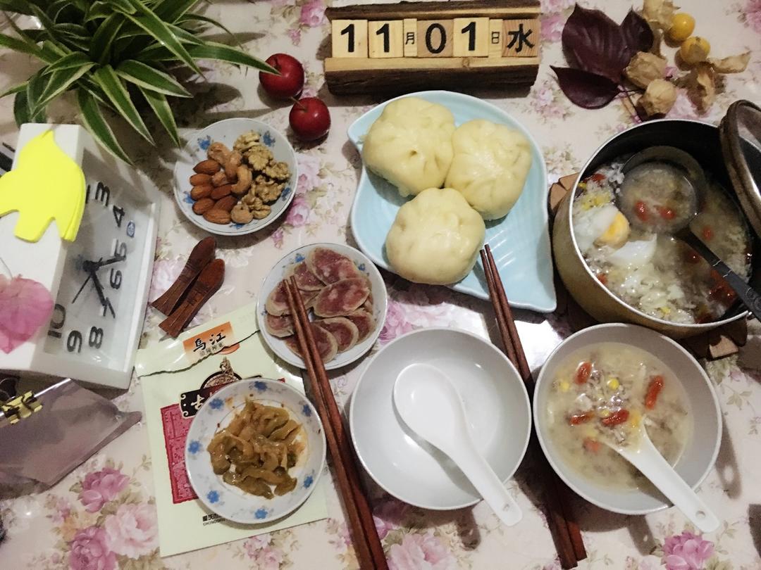 周三好☕️!今早煮了加了黑燕麦的米酒,热了包子,切点香肠配点乌江古坛榨菜,赶紧起来吃了上班去... #早餐•2017年1...