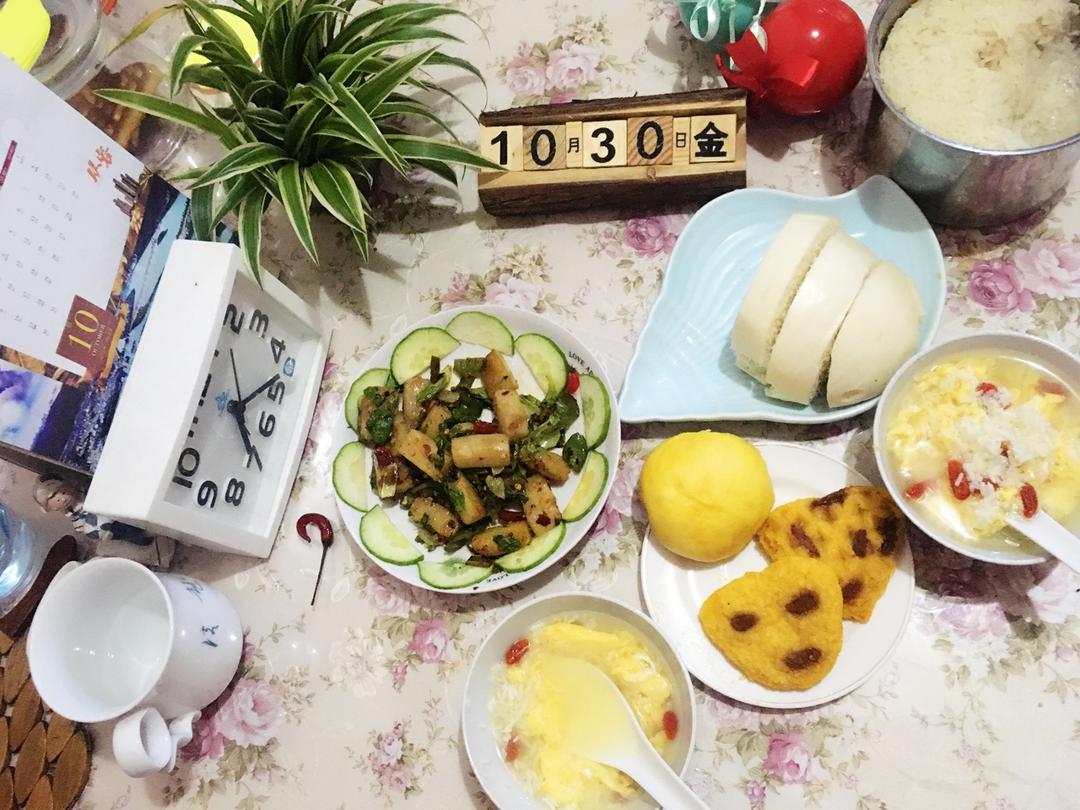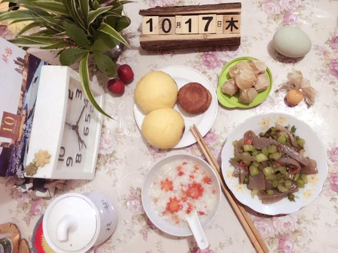 周二早☕️! 🎃馒头,🥕白米粥,小炒魔芋芹菜粒,我先吃了...