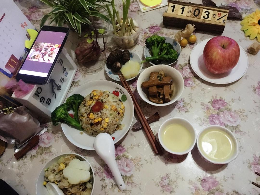 周五早☕️! 蛋炒饭+🥔+核桃🌽豆浆+芋头+西兰花+豆干+🍎...