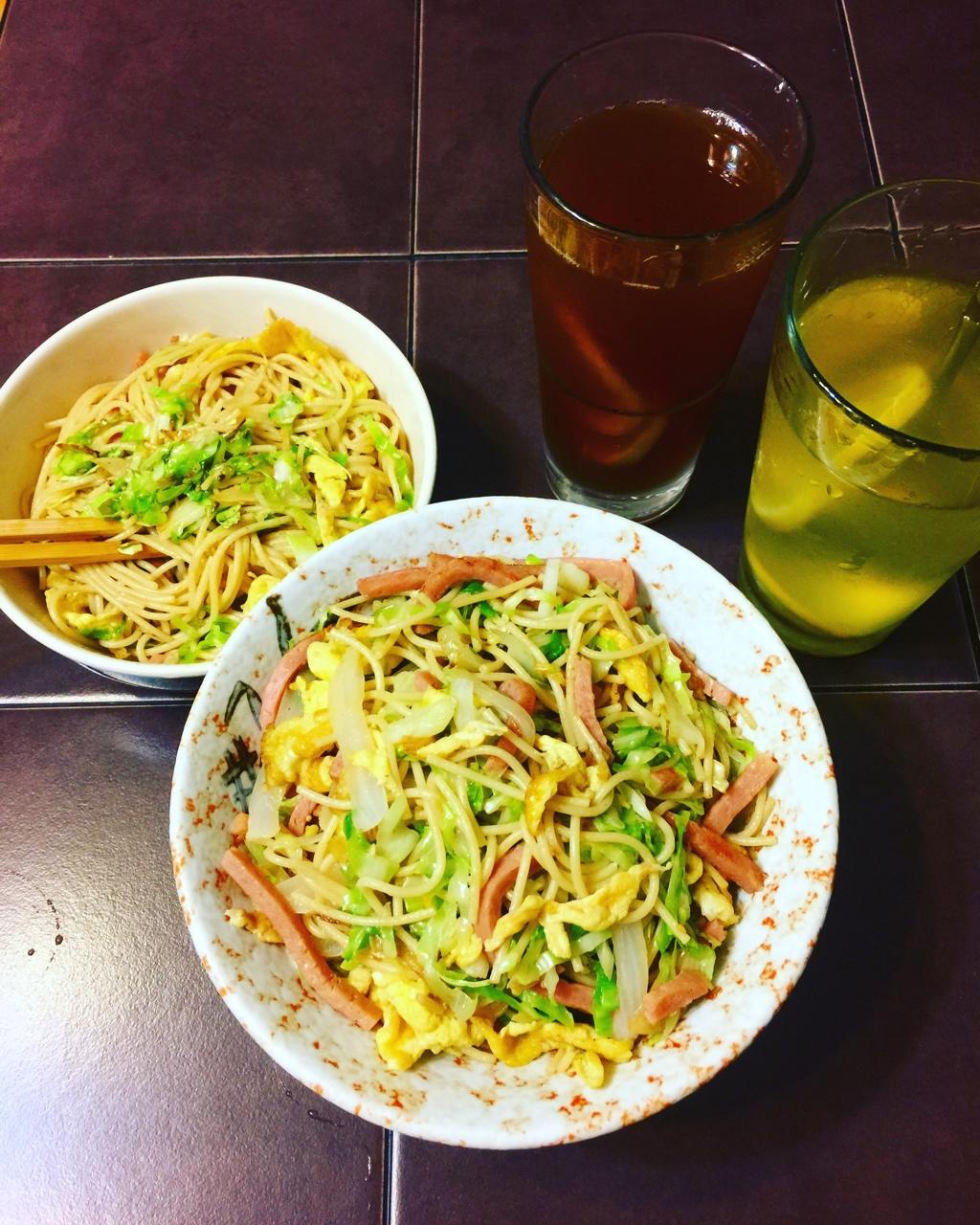 两份炒面,一杯冻柠茶一杯蜂蜜柠檬水
