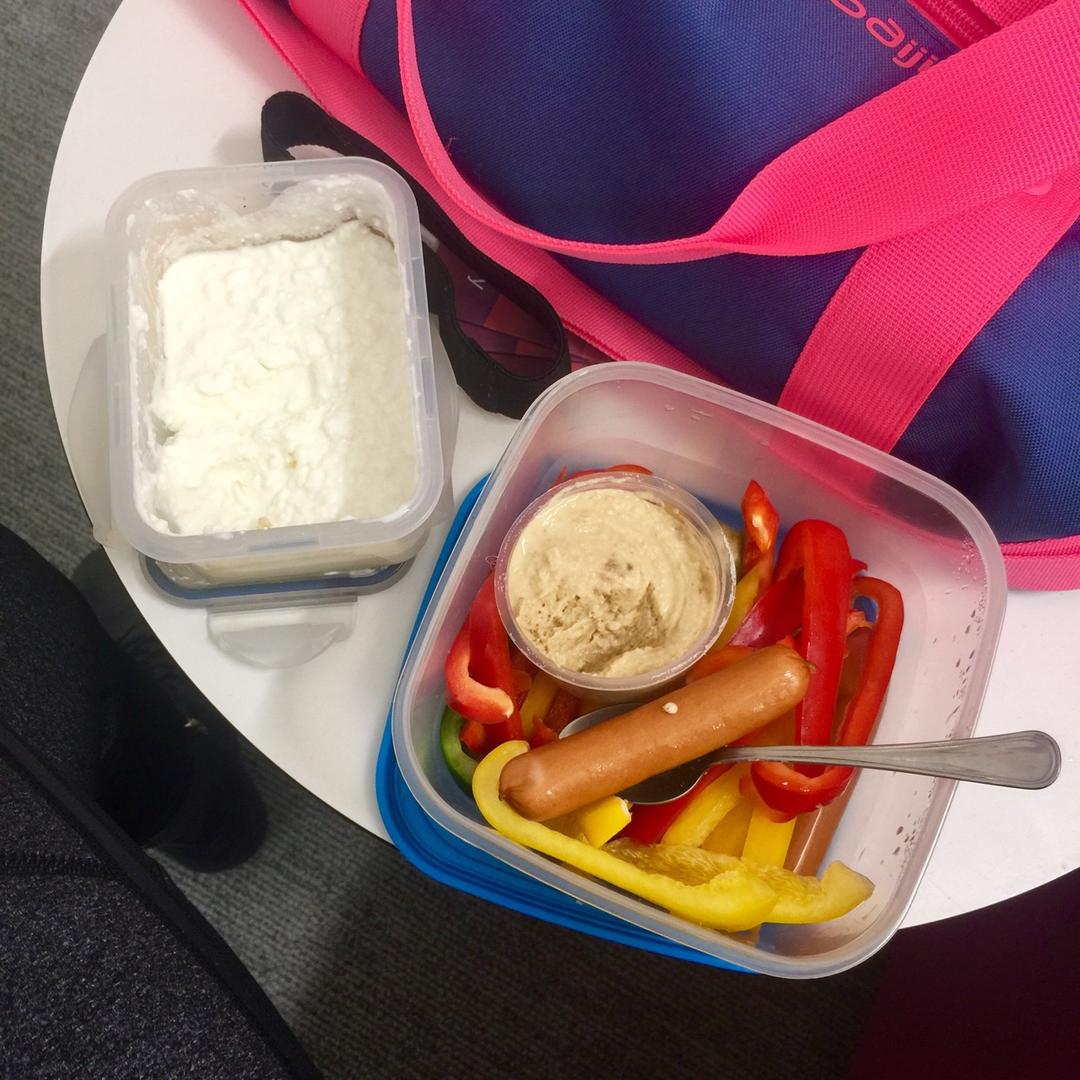 在学校的简餐,小香肠,鹰嘴豆泥,200克甜椒和乡村奶酪。今天和学校的老师聊了聊我怀孕的事,大家都一副你毕不了业了要被赶回...
