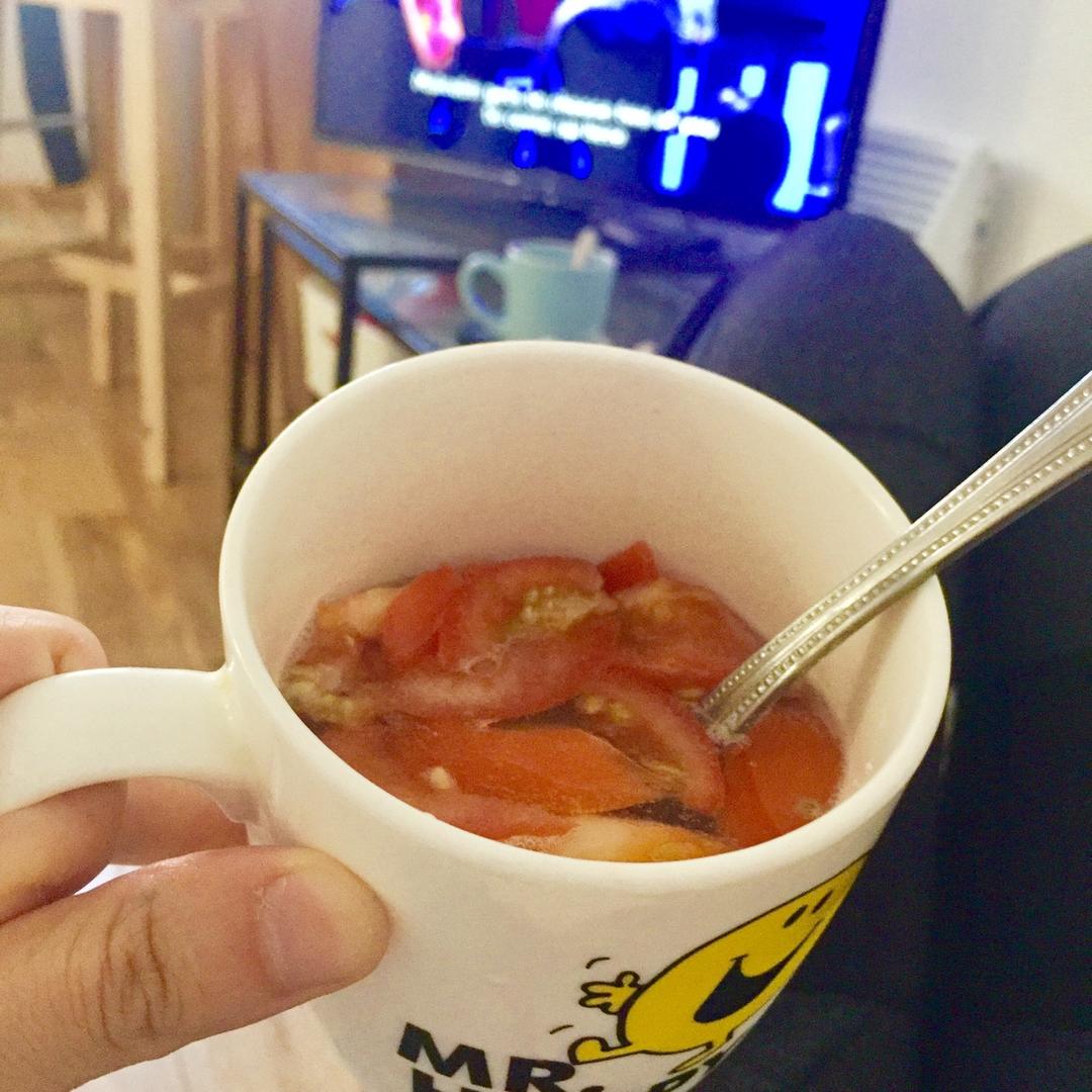 爱上了最近自制的午饭后甜点,两个冰箱拿出来的番茄用剪刀剪到杯子里,加一小勺糖,再加一杯冷苏打水。这是我每天唯一吃的精制糖...