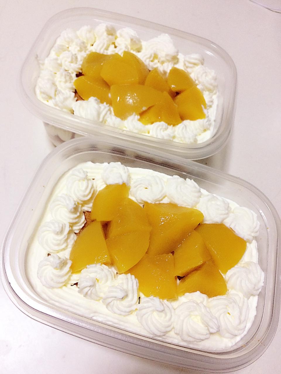 黄桃盒子,底层铺了碎黄桃,盒子蛋糕真是神奇的组合