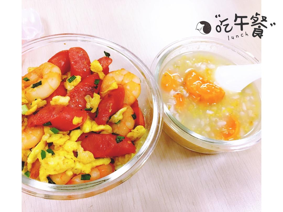 今日便当🍱:香肠鸡蛋炒虾仁+红薯燕麦粥