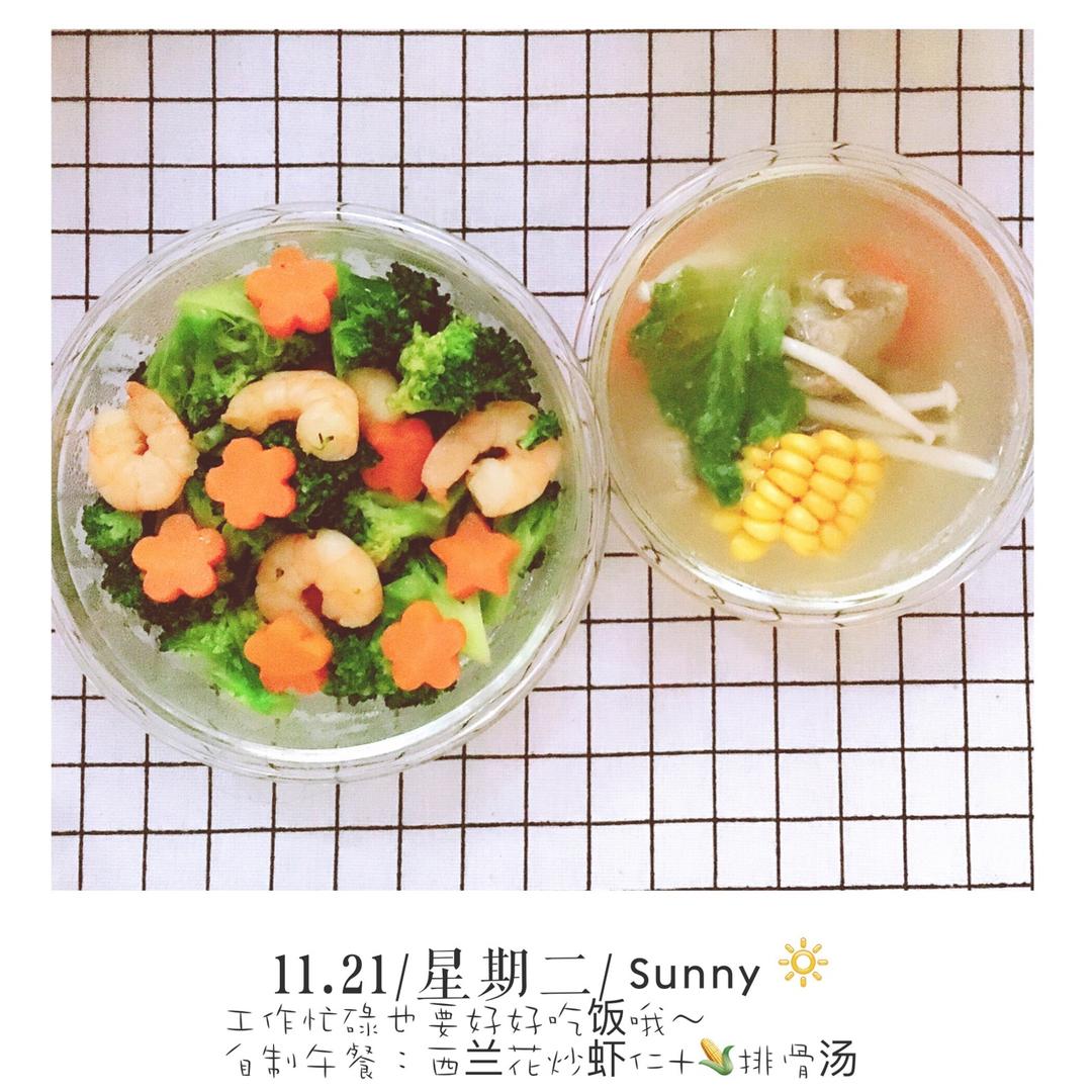 西兰花炒虾仁+排骨汤🍲