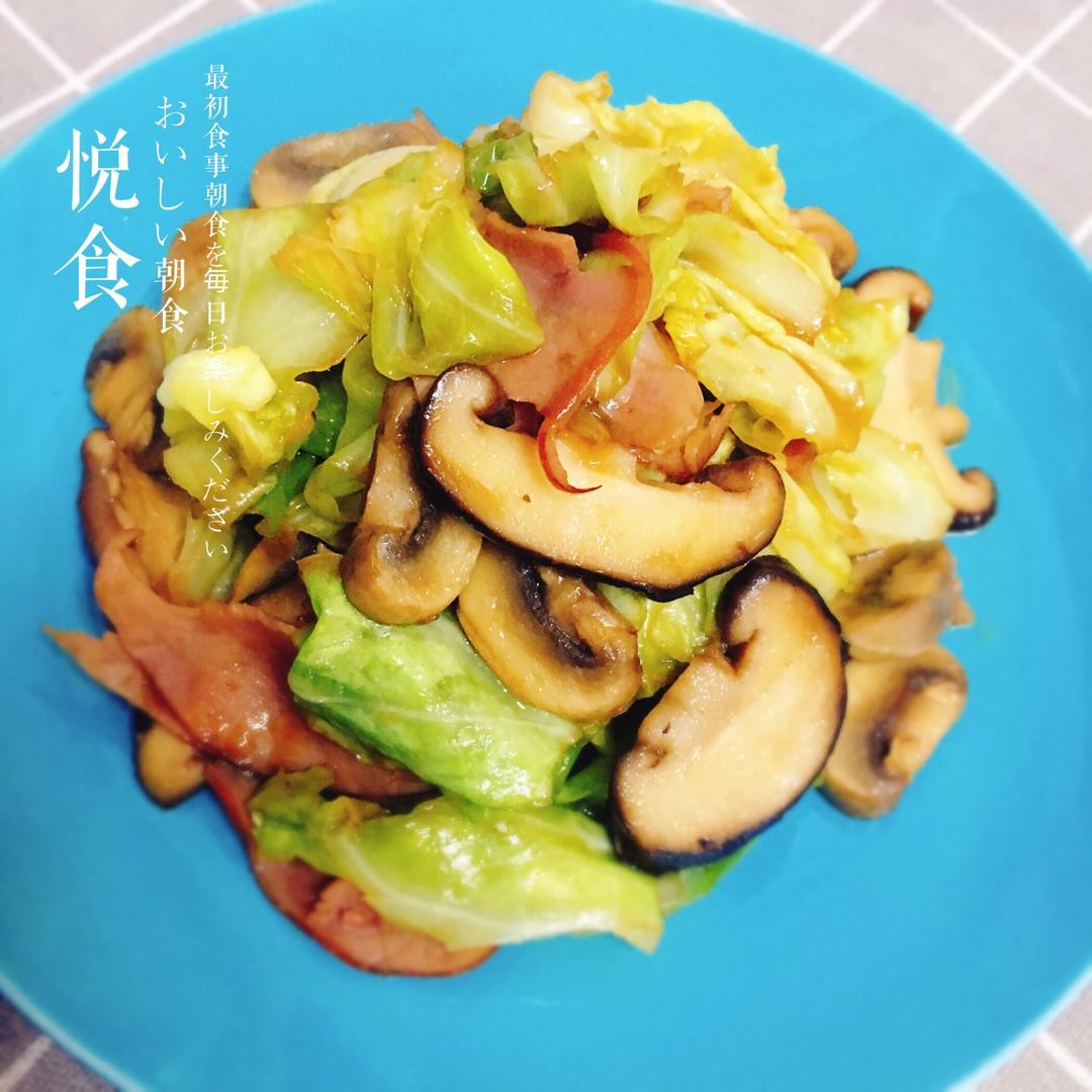 😄用零散的几个香菇、平菇和火腿肉炒了颗圆白菜,还挺下饭的🍚