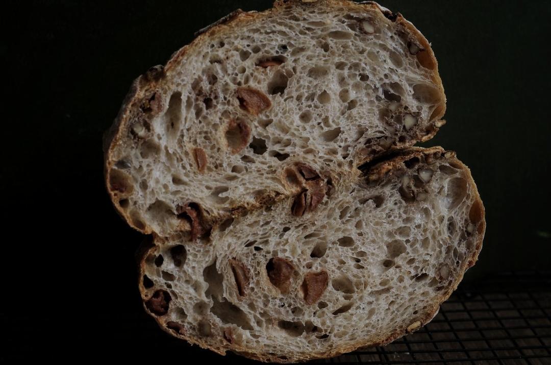 少做高水量黑麦面团再加许多辅料,发酵程度从打开的气孔也可以窥见出来,我觉得这样子的欧包口感是我最喜欢的。#早餐•2020...