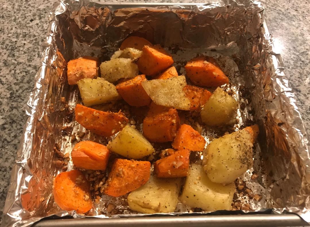 刚从国内回来,冰箱里什么菜啊蛋啊的都没有,最后从柜子里找到了一个土豆和一个红薯,还都有点发芽……加上坚果和黑胡椒烤了一下...