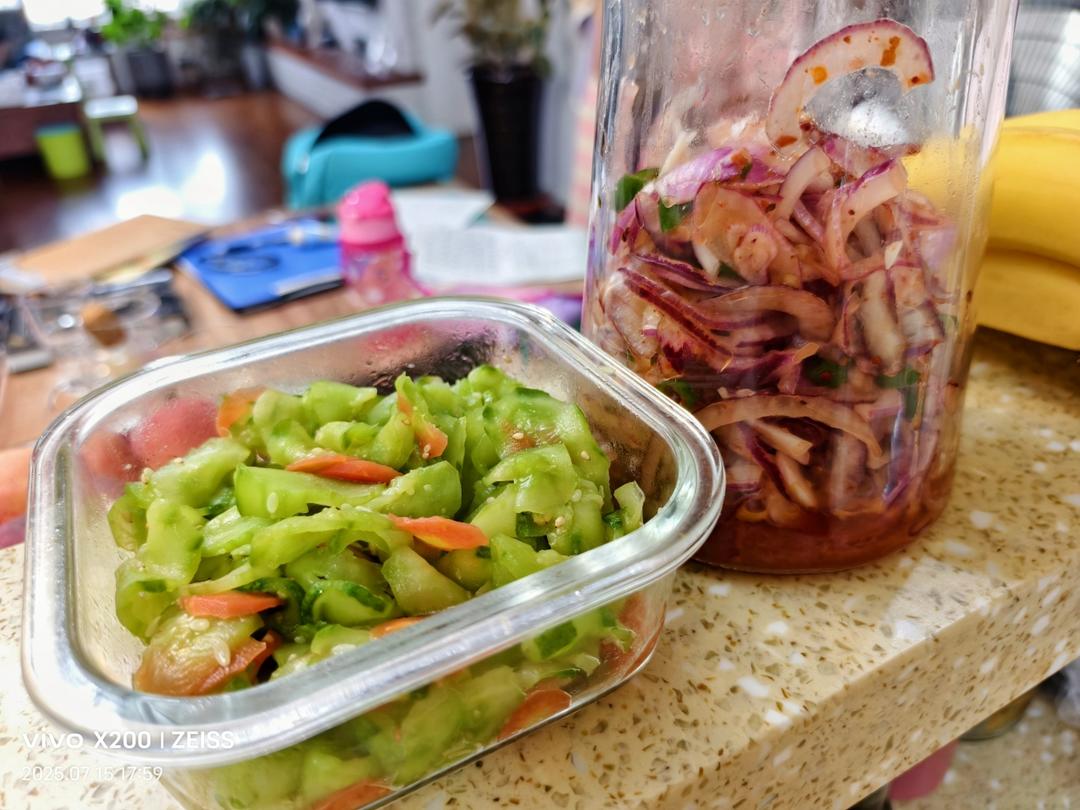 拌了两个小菜,一个脆黄瓜,一个洋葱丝,屯在冰箱里可以吃几天,吃饭可以加一点调味...