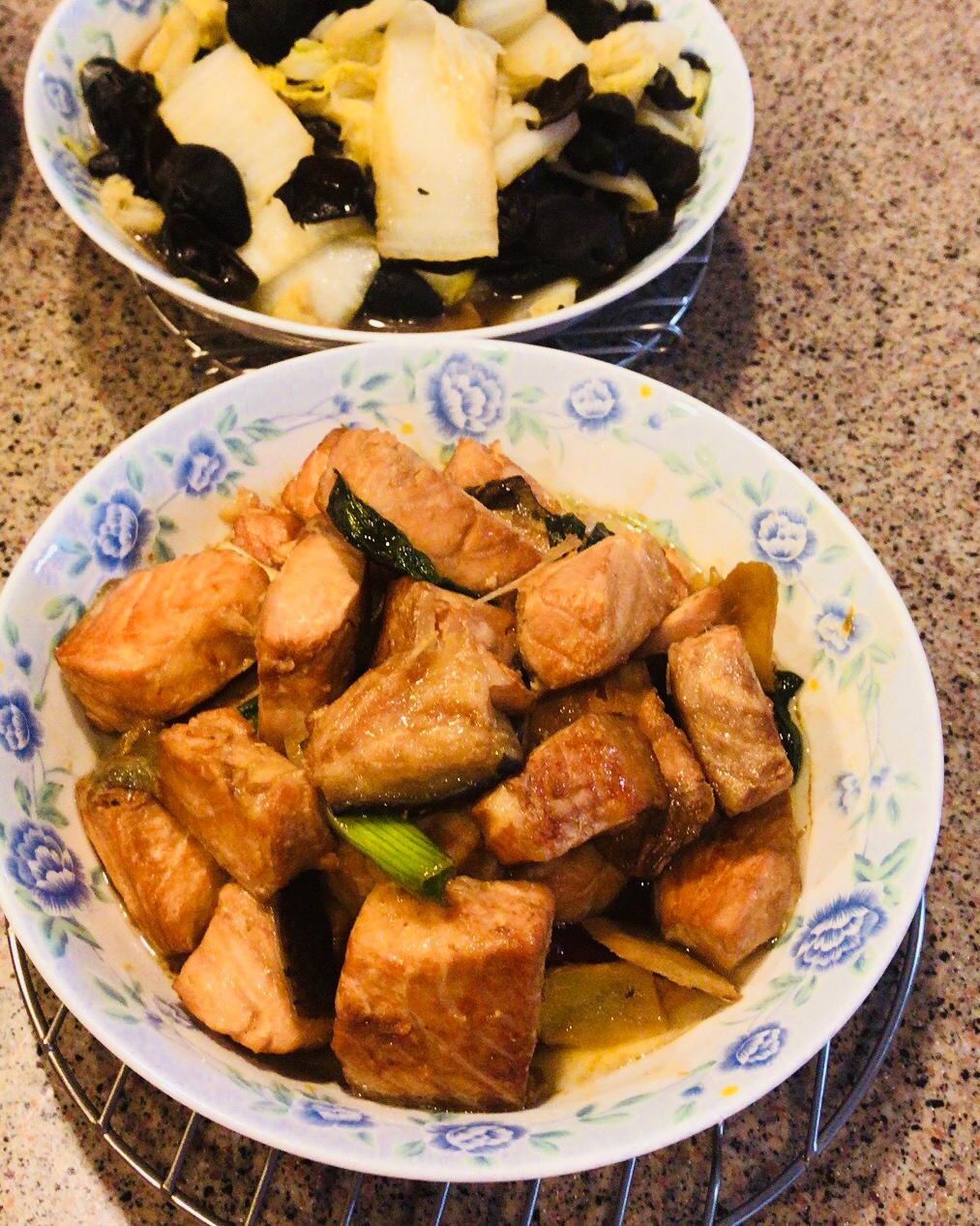 葱油蒜香煎三文鱼+大白菜炒黑木耳