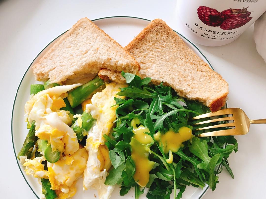 芦笋炒鸡蛋,沙拉菜,发芽米面包,一份树莓酸奶,蜂蜜水