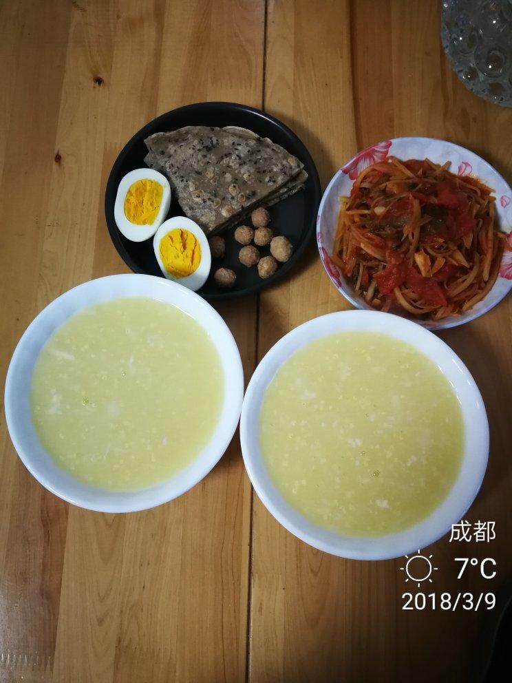 今日早餐:玉米糊、白水鸡...