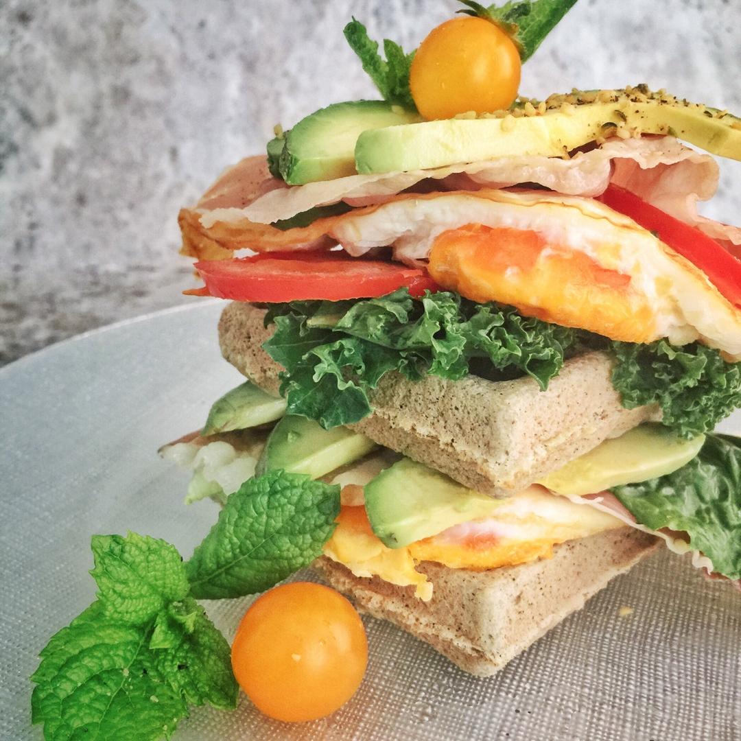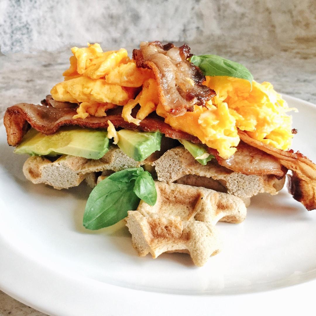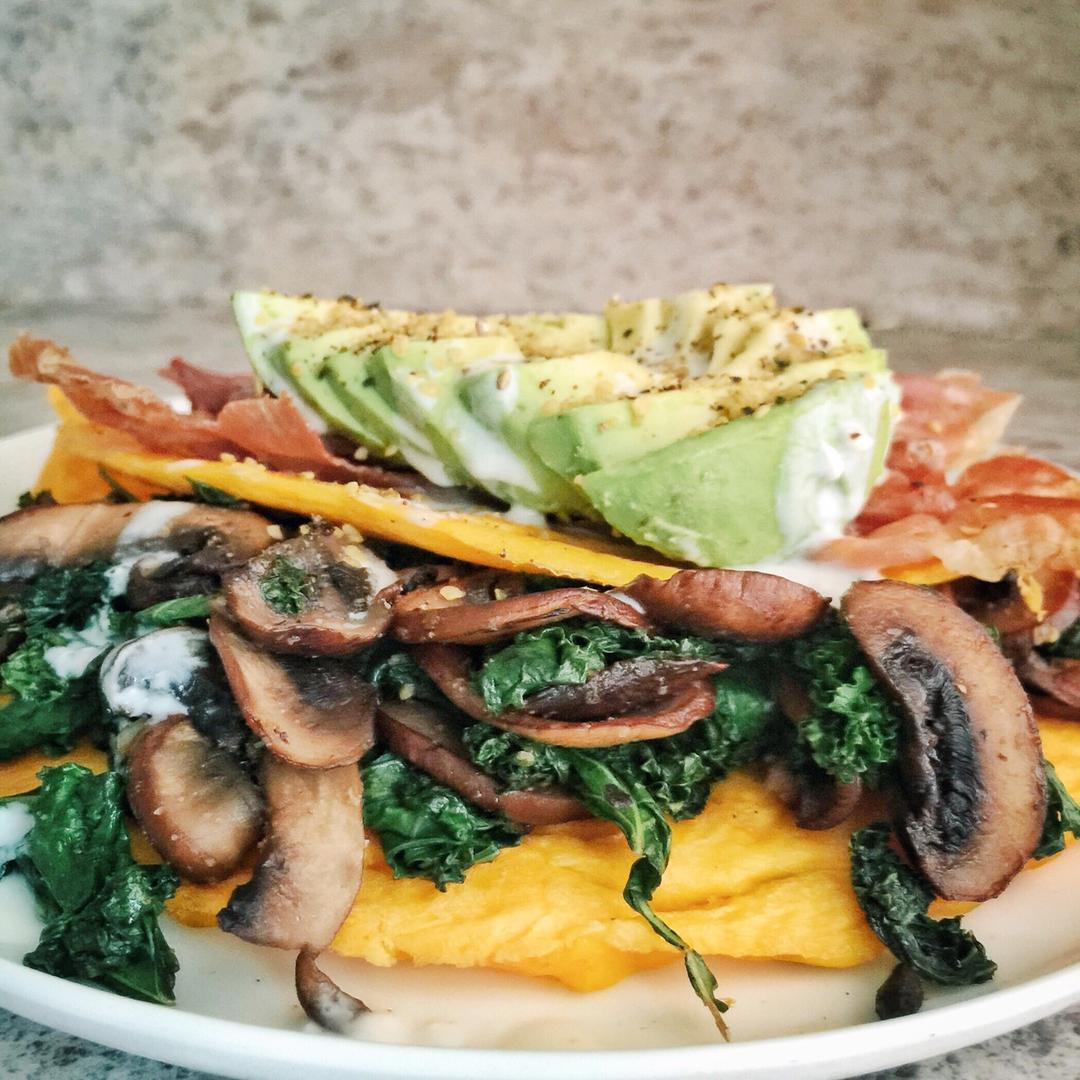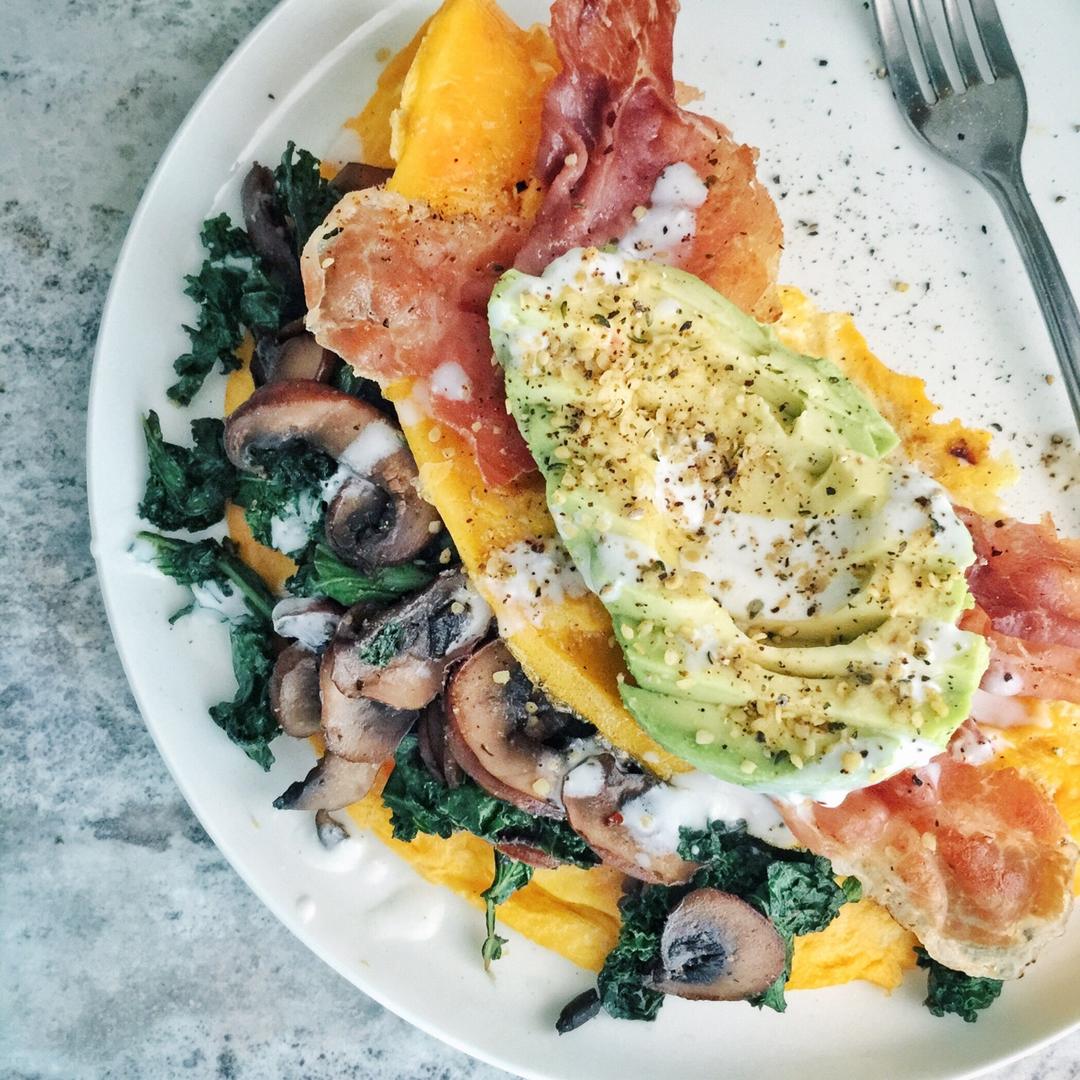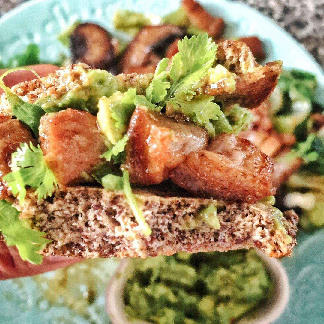 Flaxseed meal pancakes, guacamole, cilantro, pork belly. 生酮...