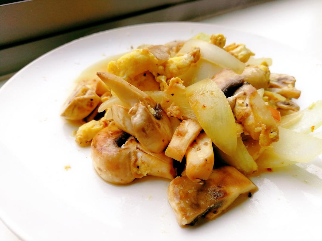 白菇洋葱炒鸡蛋。期末周了,不折腾不折腾。随便搞搞就行。