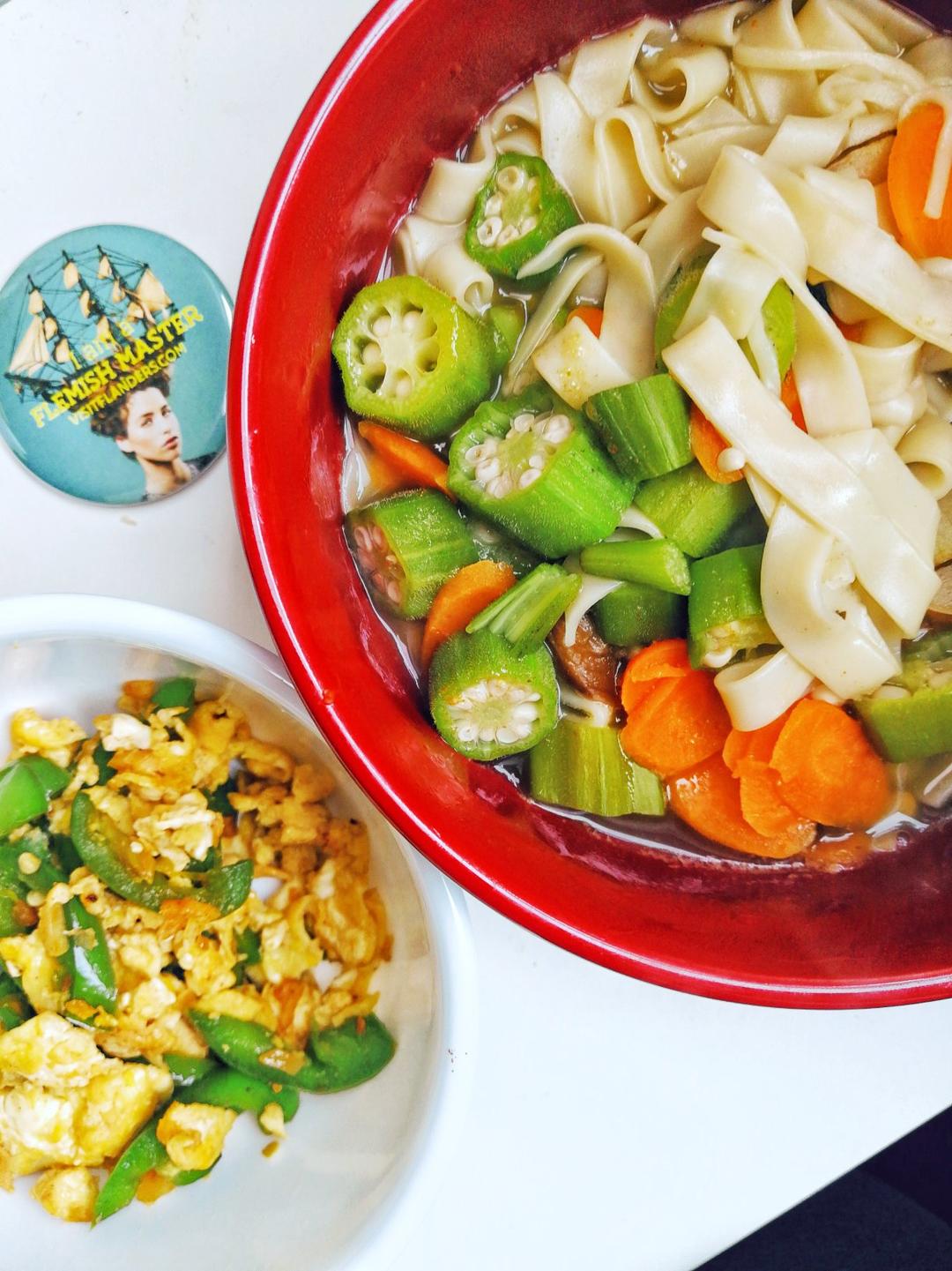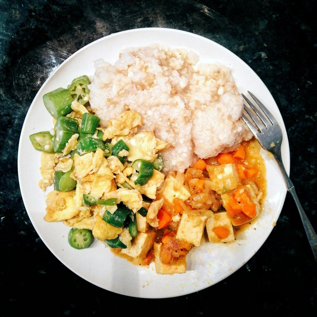 秋葵炒鸡蛋 昨天的咖喱豆腐和杂粮粥 看起来真的是很多...