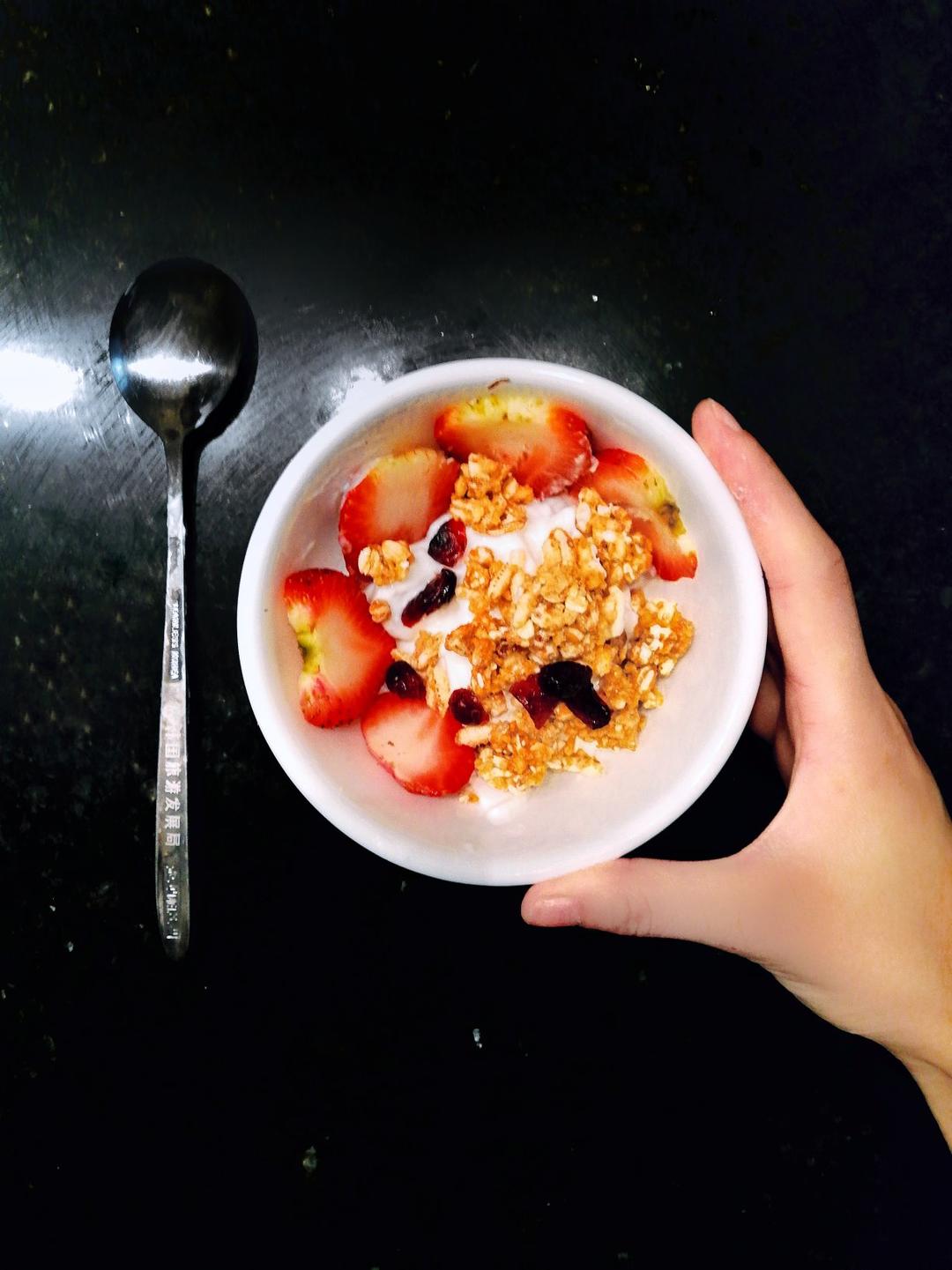 就酸奶草莓🍓Granola和蔓越莓干 凑活吃吧 赶着去学习