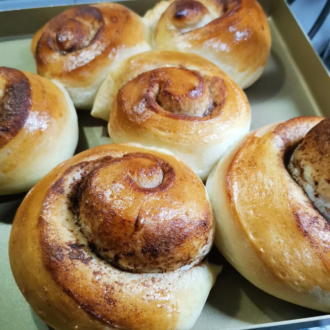 肉桂面包卷 形态比较好的一次,明早又可以吃面包,喝拿铁咖啡啦。