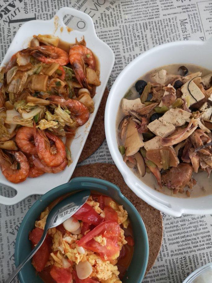大虾炒快菜,鸡肉炖豆腐,番茄炒蛋