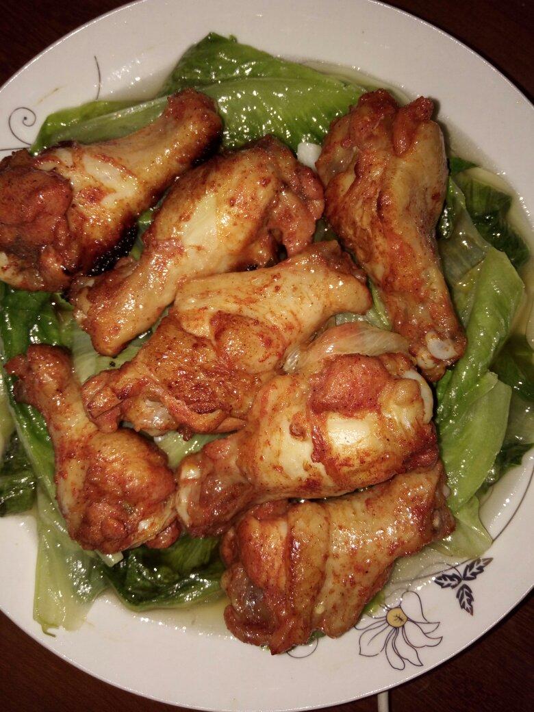 开饭:奥尔良鸡翅根配蒜泥生菜