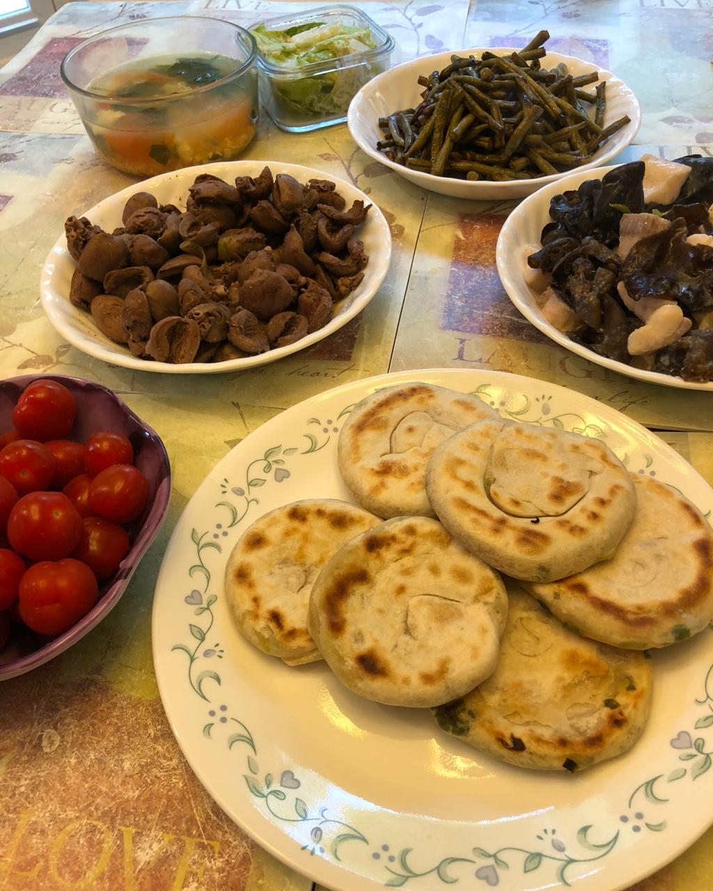 葱油饼,鱼块,爆炒鸡心,……