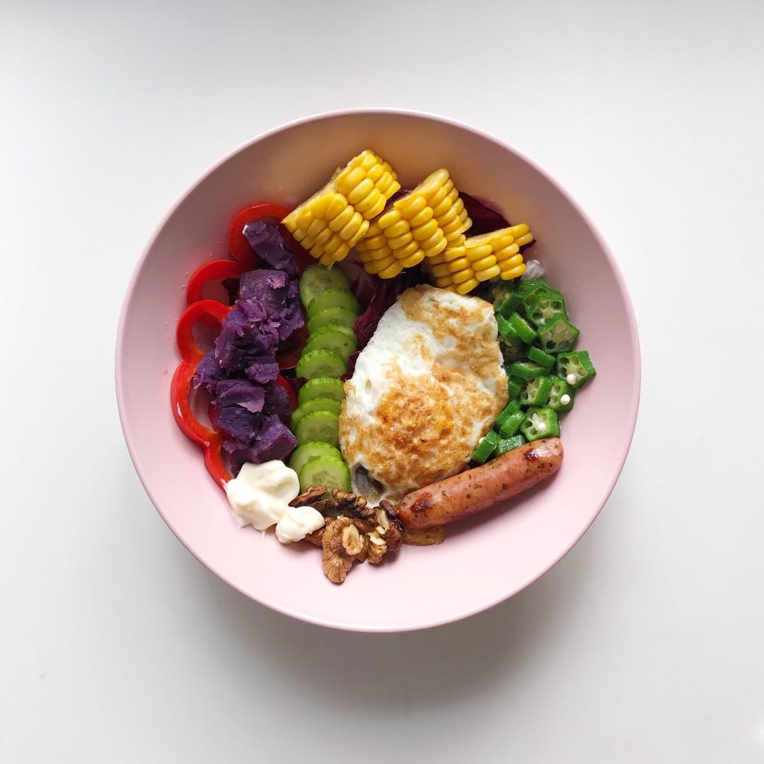 球形生菜 秋葵 玉米 青瓜 紫薯 甜椒 烤肠 煎蛋