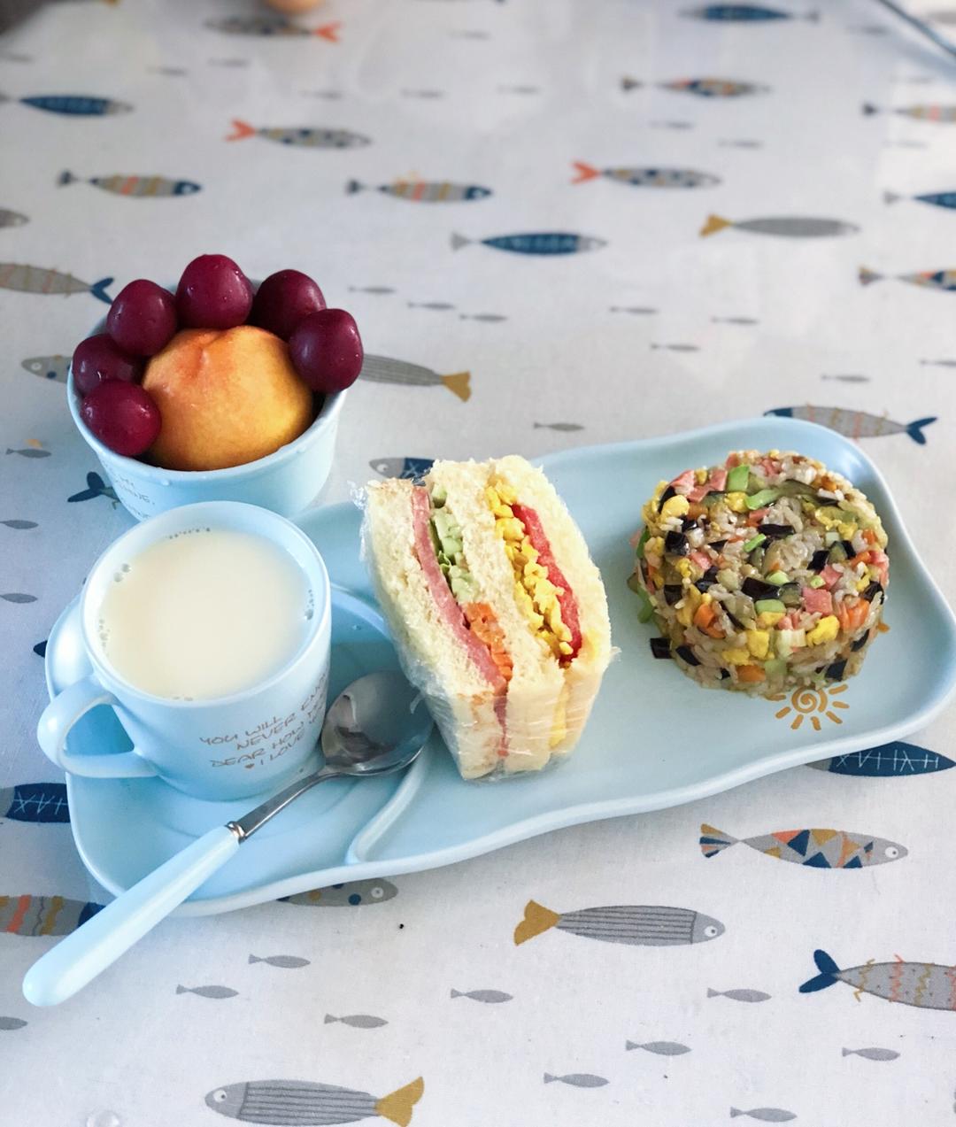 茄子蛋炒饭,鸡蛋火腿三明治,原磨豆浆,水果