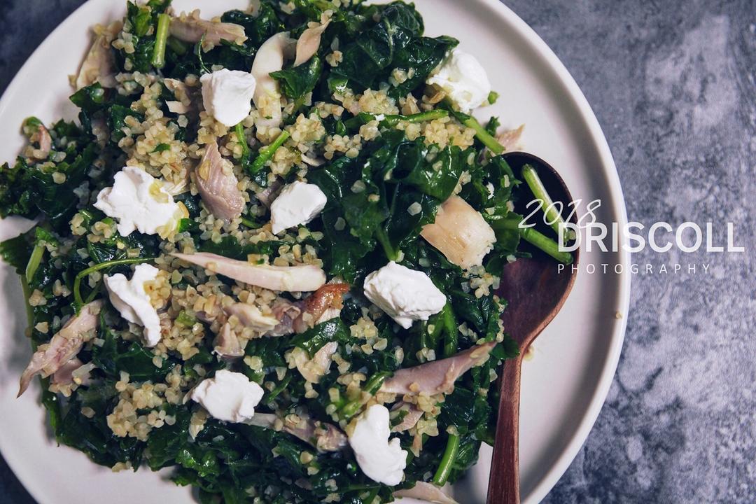 DAY 3(用時10分鐘):羽衣甘藍布格麥雞胸克菲爾芝士沙拉。同昨天一樣,晚上將羽衣甘藍洗淨,加海鹽、橄欖油按摩後放入密...