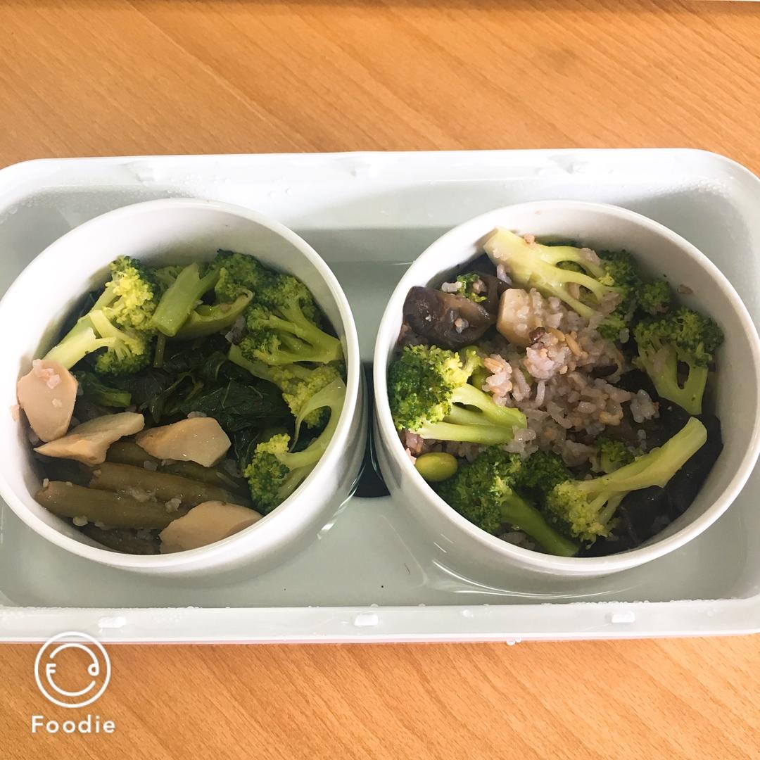 无油刀豆土豆,无油西兰花黑木耳杏鲍菇,炒地瓜叶,燕麦米黑米白米饭