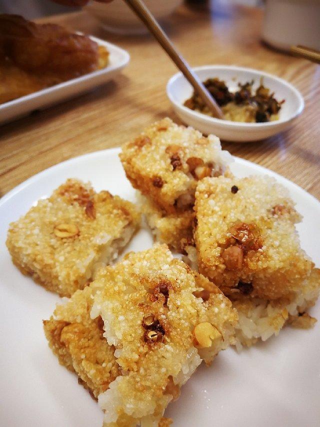 点了他家的油炸方糕,感觉是用熟糯米拌了食用油里面加了熟花生米和花椒和盐;等回家了试试做给家...