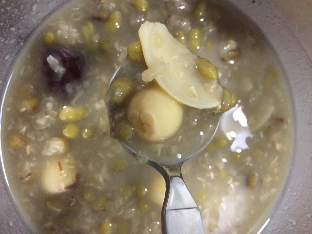 绿豆,糯米,百合,莲子,红枣,桂圆,冰糖。好喝又大补呀!