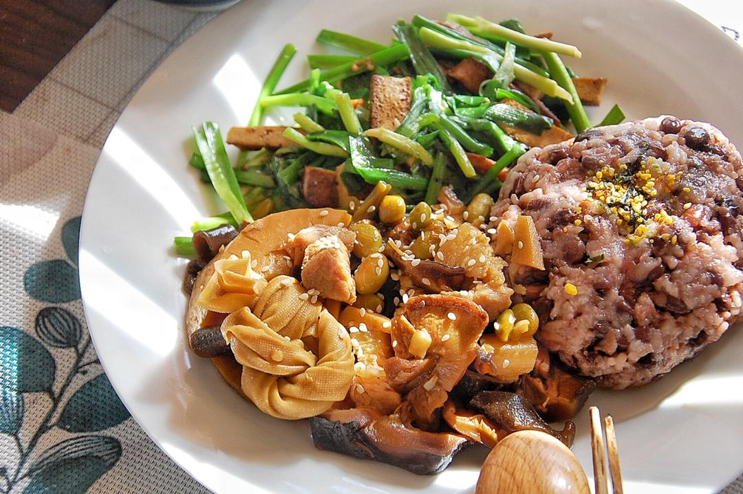 百叶结香菇笋片毛豆木耳肉片什锦菜
