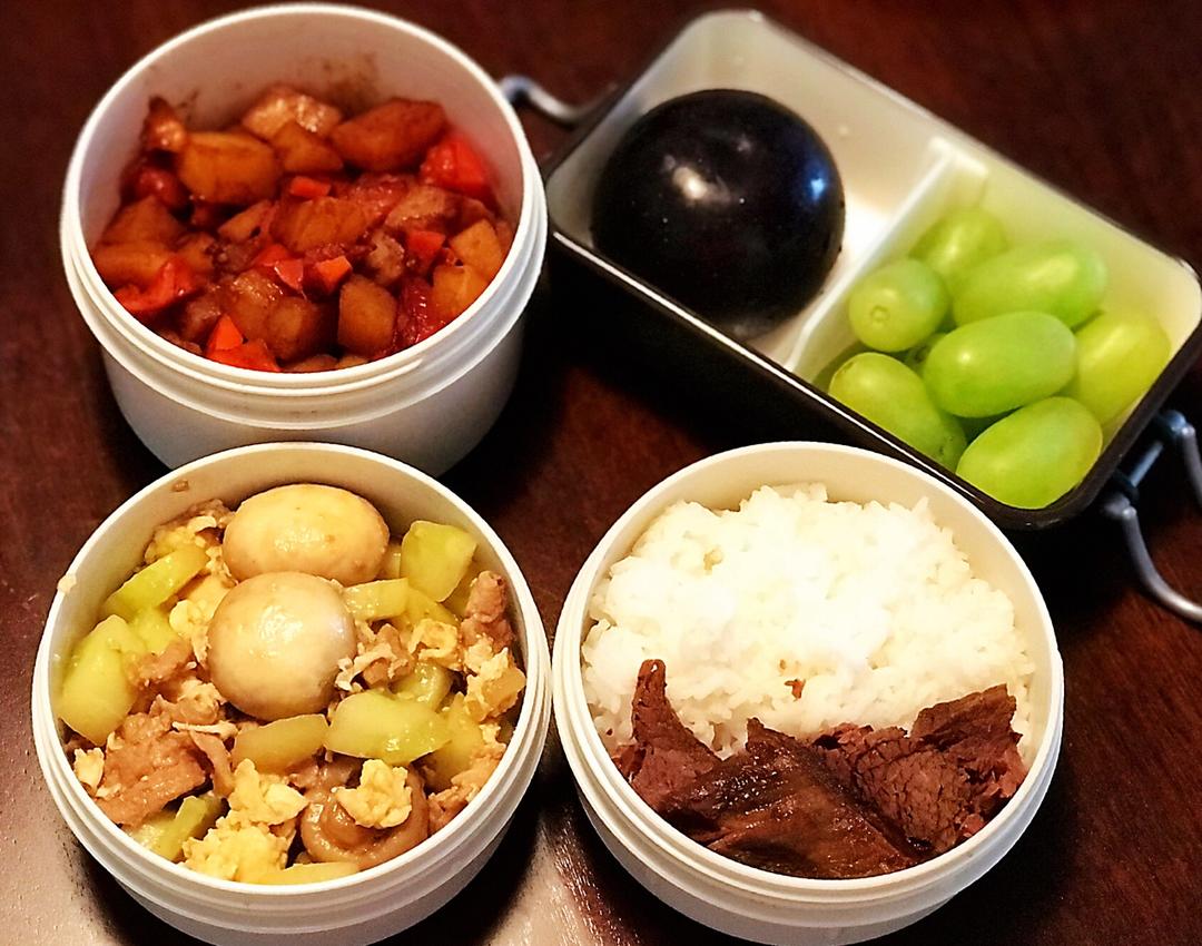 ☀️午餐便当🍱🍅🥔🥕,🥒🍄肉片鸡蛋,🍚,酱牛肉,水果。开学第一天,孩子们都加油💪[胜利]