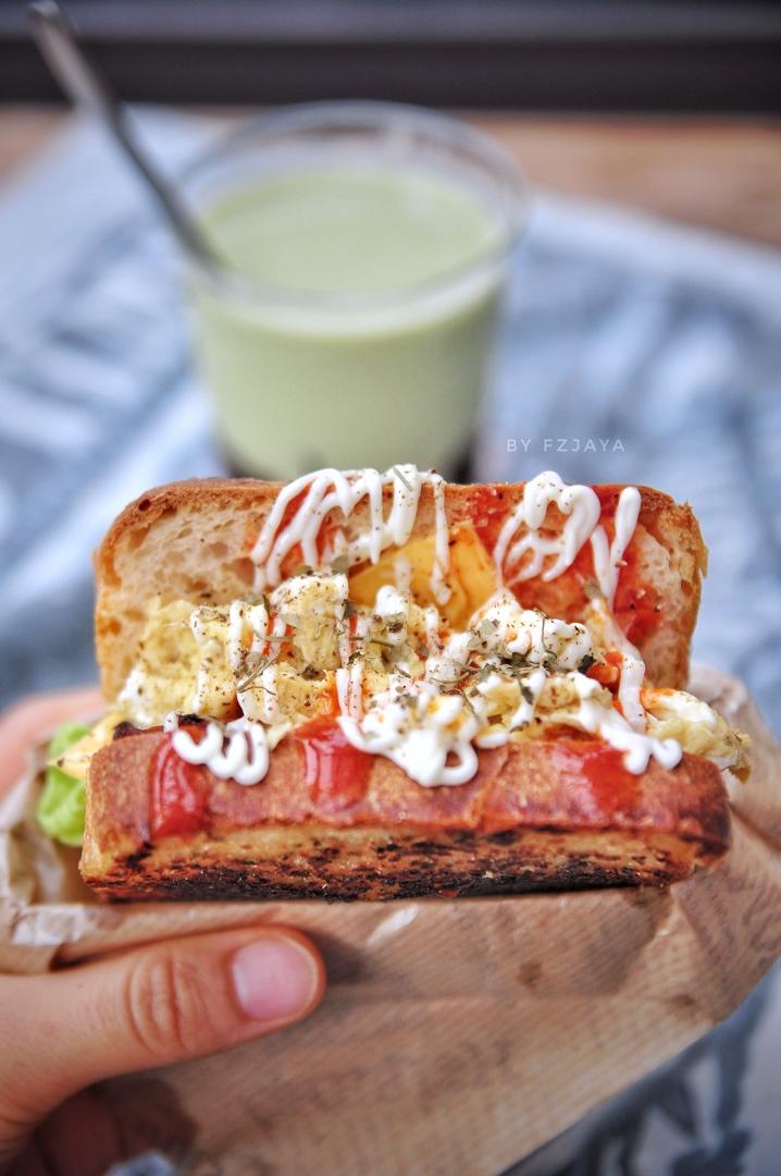 一片红糖核桃欧包和菠萝一起火烤,煎个午餐肉和太阳蛋,做成了开放三明治