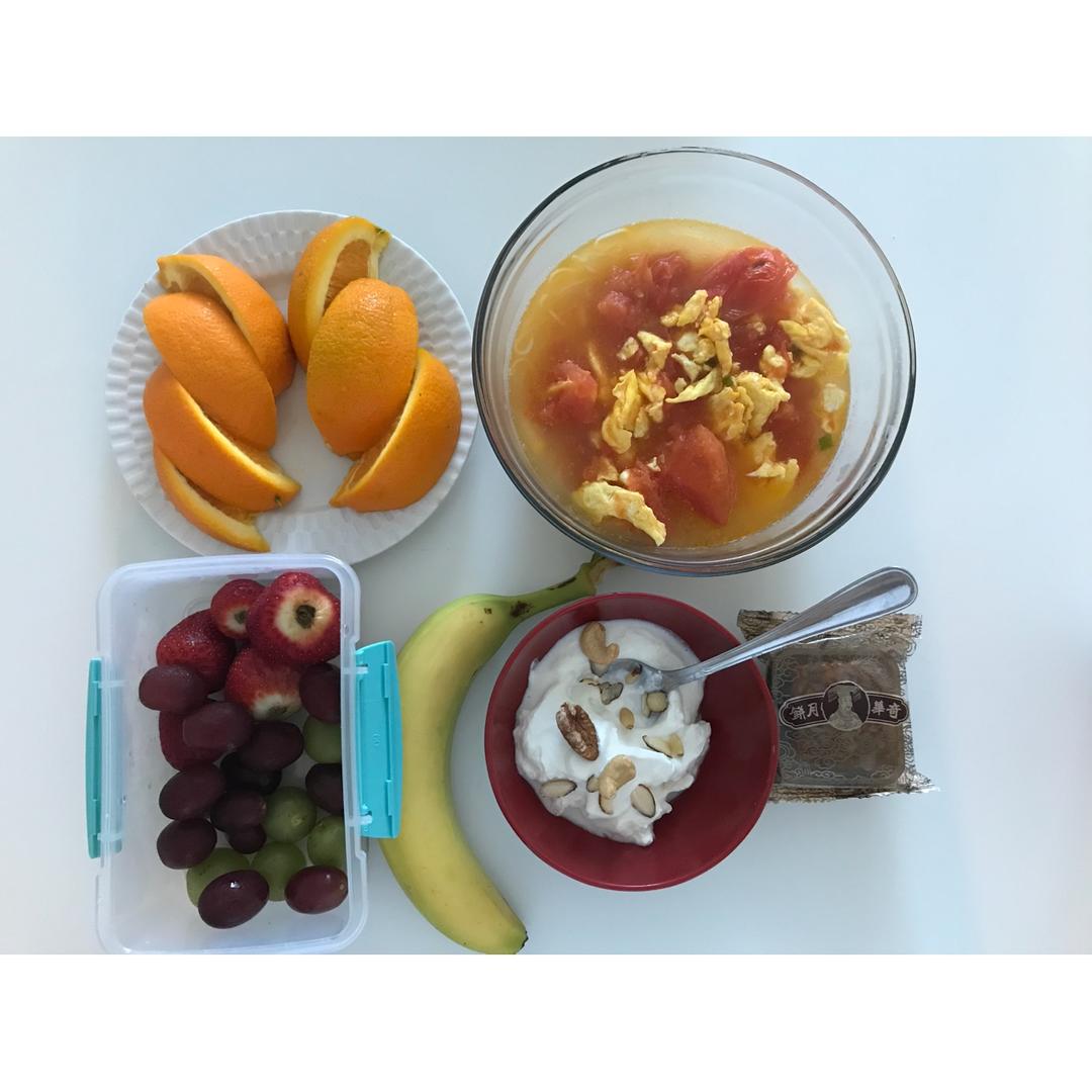 橙子 水果 香蕉 西红柿鸡蛋面 希腊酸奶+坚果 奇华迷你蛋黄莲蓉月饼