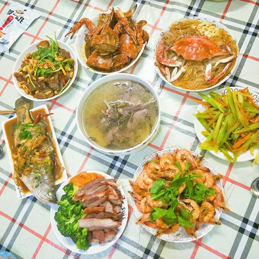 佳节配佳肴:醉熟蟹➕醋姜👍、玉竹沙参鸡汤、清蒸生蚝、蛋炒饭、姜葱虾➕卤牛腱子➕盐煎梅花肉➕...