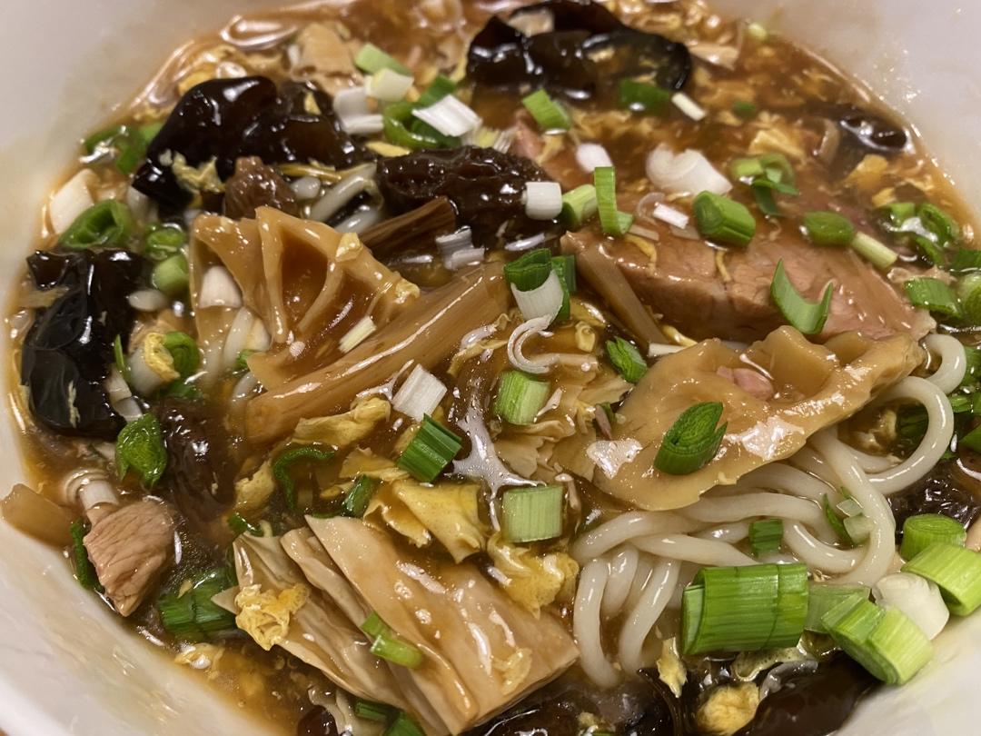 寿面的卤子,里面多放了干贝,超级棒的……往里面放虾汤果然绝妙。感谢up主的好方子!哈哈!