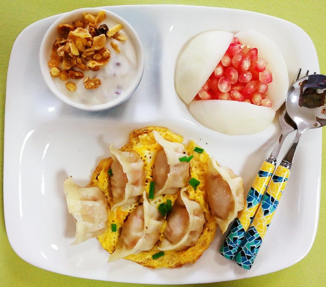 抱蛋煎饺、谷物酸奶、水果~