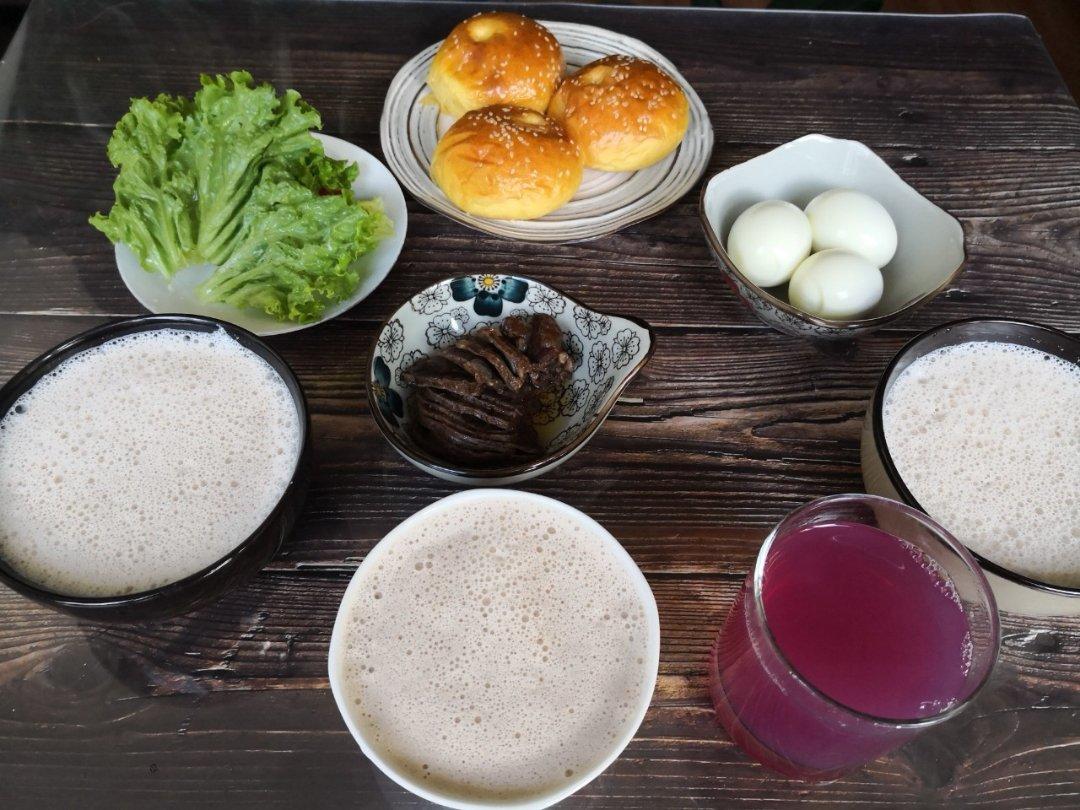 小面包,白煮蛋,卤牛肉,生菜,香蕉核桃奶昔,葡萄汁~