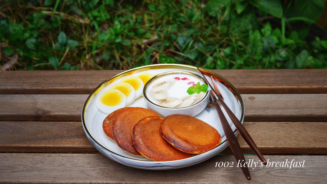 全麦香蕉松饼+香蕉酸奶+水煮蛋切片